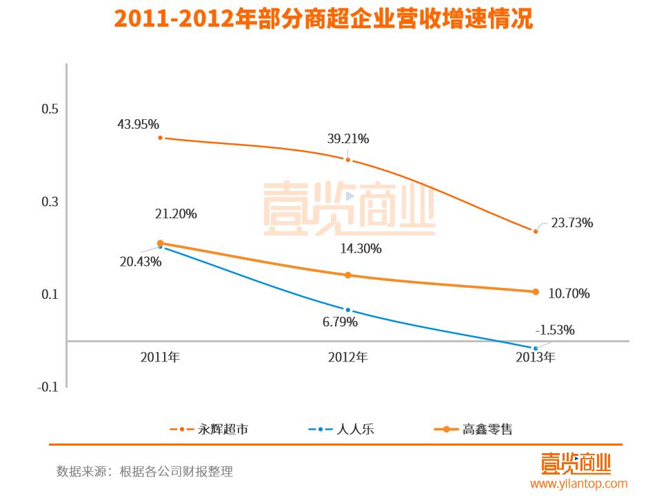 这导致多家实体零售企业业绩增速开始放缓。比如永辉超市,2011-2012年,分别实现营收177.31亿元、246.84亿元,虽然总体表现依旧强劲,但增长速度开始由40%-50%区间下滑到30-40%区间;再比如人人乐,同期营收分别为120.91亿元、129.13亿元,同比增长由20.43%大幅下滑至6.79%。