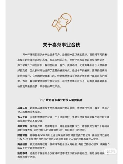 除了店面的要求,对合伙人的筛选,喜茶也提出了较高的要求。