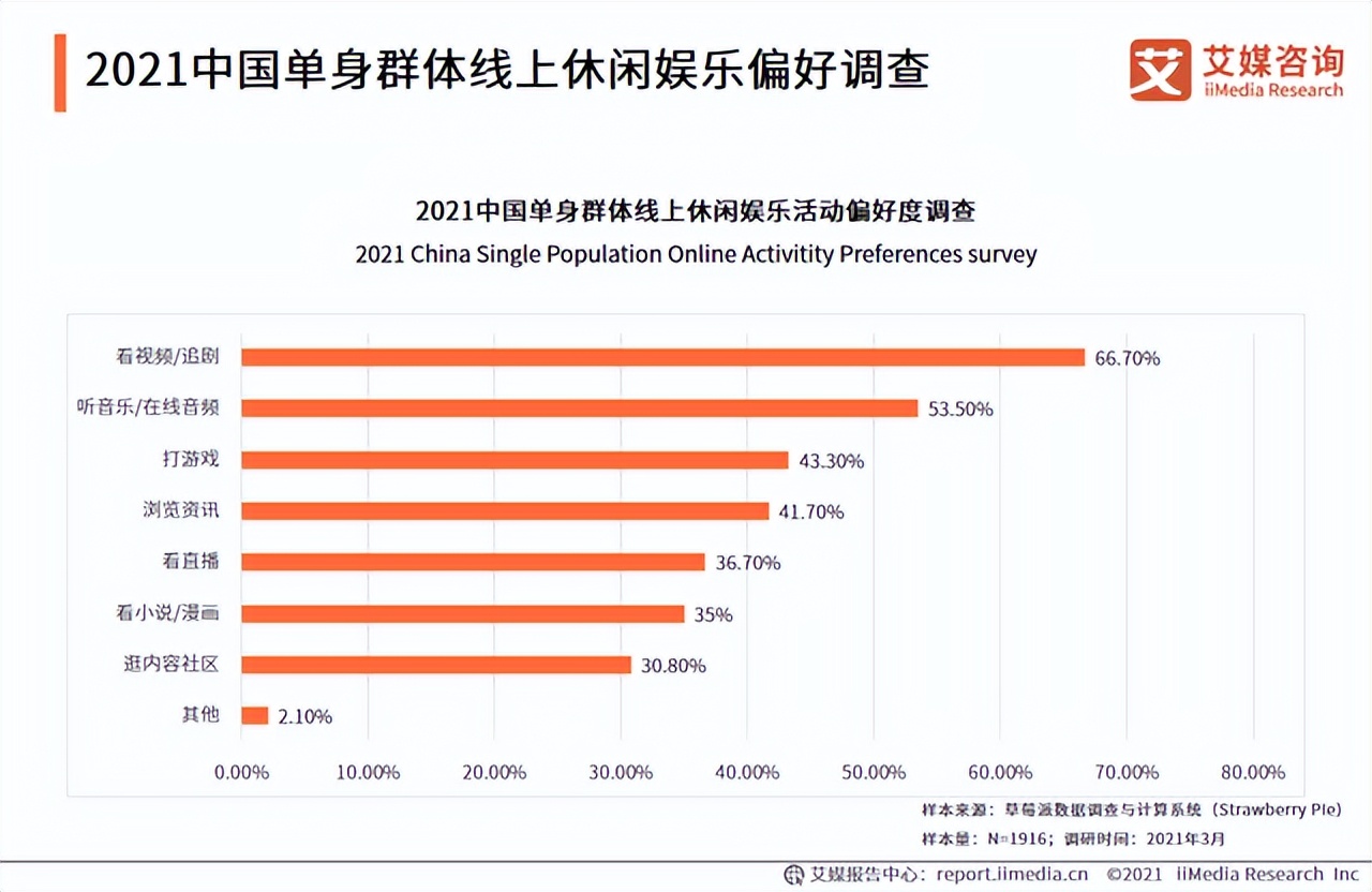 而在艾媒咨询2021年发布的《2021中国单身群体消费行为调查及单身经济趋势分析报告》中,“打游戏”也以43.30%的比例,在中国单身群体线上休闲娱乐偏好调查一项中排名第三。