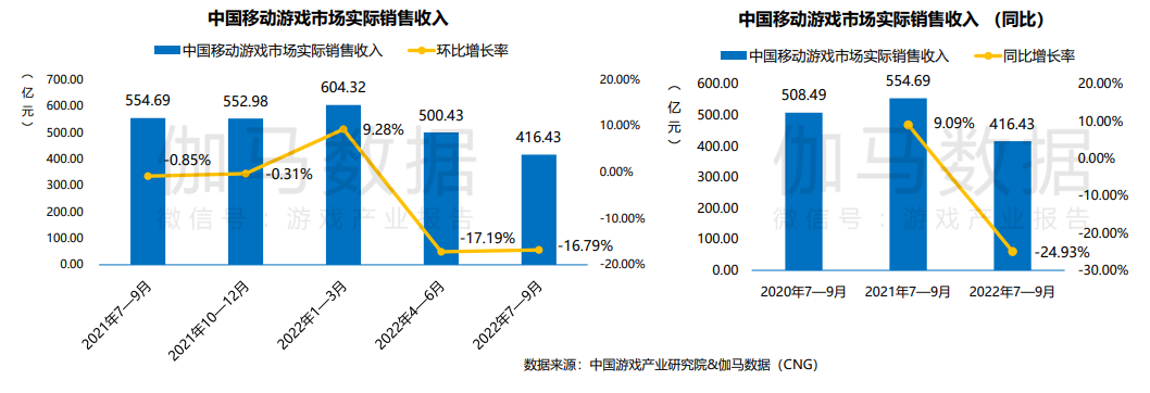 根据伽马数据发布的《2022年第三季度(7-9月)游戏产业报告》数据显示,2022年7-9月,中国游戏市场实际销售收入为597.03亿元,环比、同比均有所下降,其中环比下降12.61%,同比下降19.13%,主要原因是过去“贡献了最大收入比重的移动游戏市场则创下了近5个季度最低市场规模记录,用户付费能力与活跃时长均有下降”。