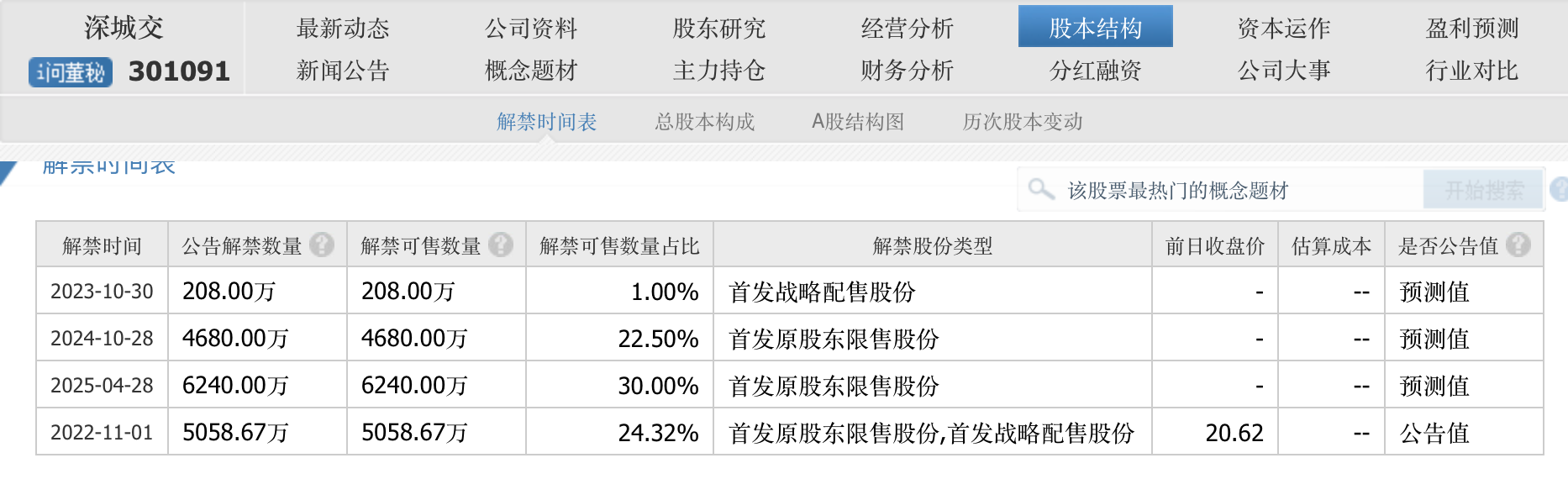 资料显示,深城交共计有5058.67万股(占总股本的24.3205%)的股份在11月1日解禁,其中,首次公开发行前已发行限售股数量为4680万股,占公司股本总数的22.50%,限售期为自公司首次公开发行并上市之日起12个月;首次公开发行战略 配售限售股数量为378.6737万股,占公司股本总数的1.8205%,限售期为自公司首次公开发行并上市之日起12个月。