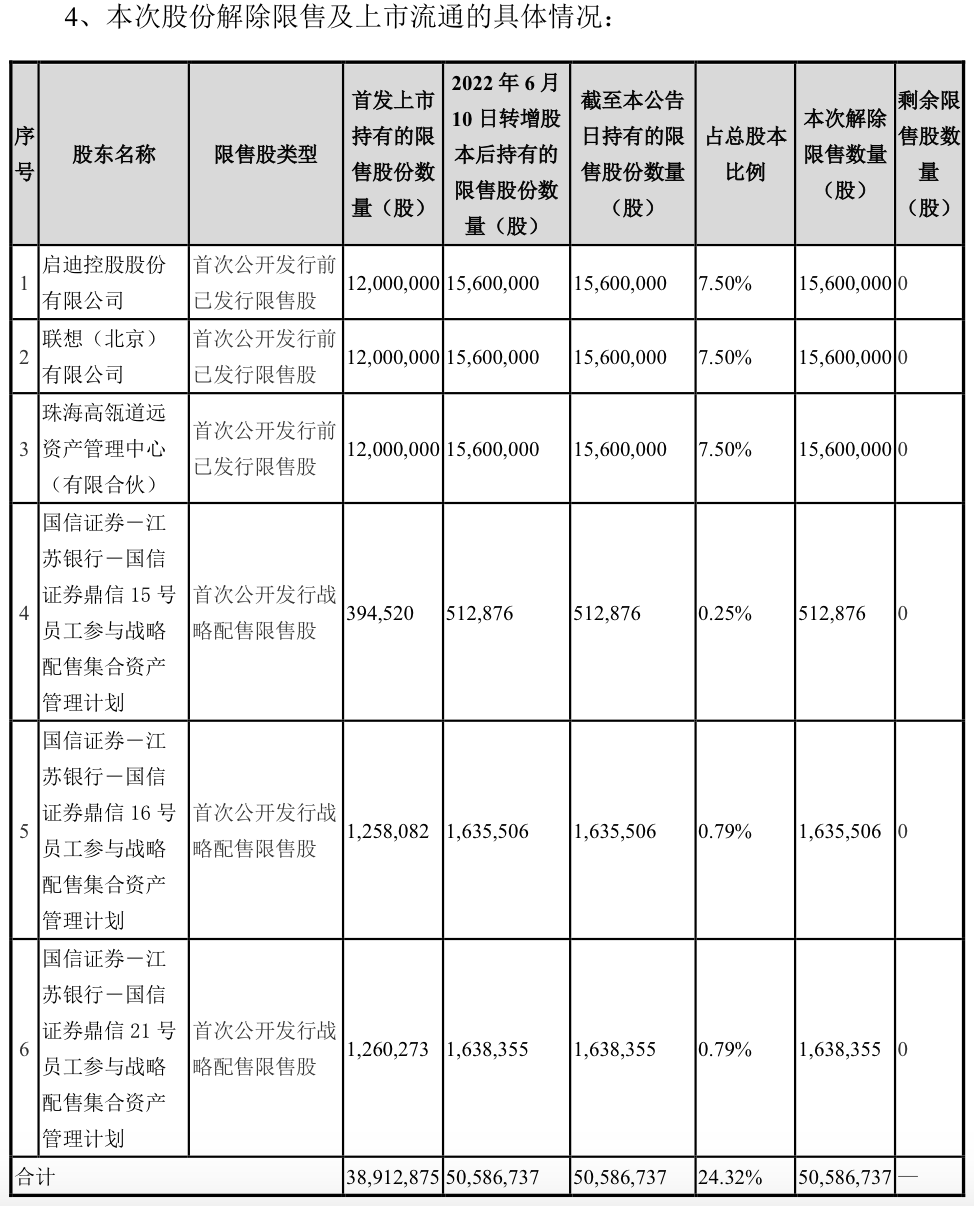 本次解除限售的股东户数共计6户,其中的启迪控股股份有限公司(下称启迪控股)、联想(北京)有限公司(下称联想北京)、珠海高瓴道远资产管理中心(有限合伙)(下称高瓴道远)分别持有1560万股,占比均为7.5%。