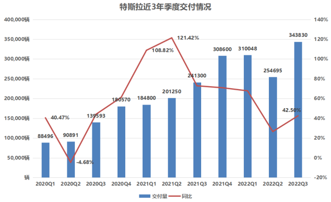今年第三季度,特斯拉官方表示,期望在未来几年,汽车年均交付增长率能够达到50%以上,2022年年交付达150万辆的目标。从交付情况来看,特斯拉在今年的前三个季度总交付量达908573辆,已接近去年全年的交付量(936172辆)。