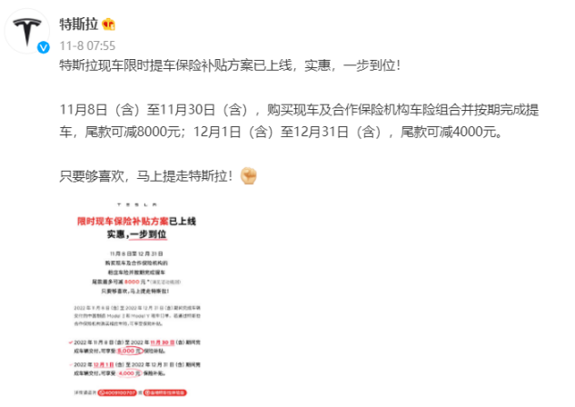 刚调价不久,特斯拉再次给出优惠政策,并于11月8日宣布上线现车限时提车保险补贴方案。官方表示,11月8日(含)到1至12月31日(含)期间完成车辆交付的中国制造Model 3和Model Y 现车订单,若通过特斯拉合作保险机构购买相就车险,可享受保险补贴。