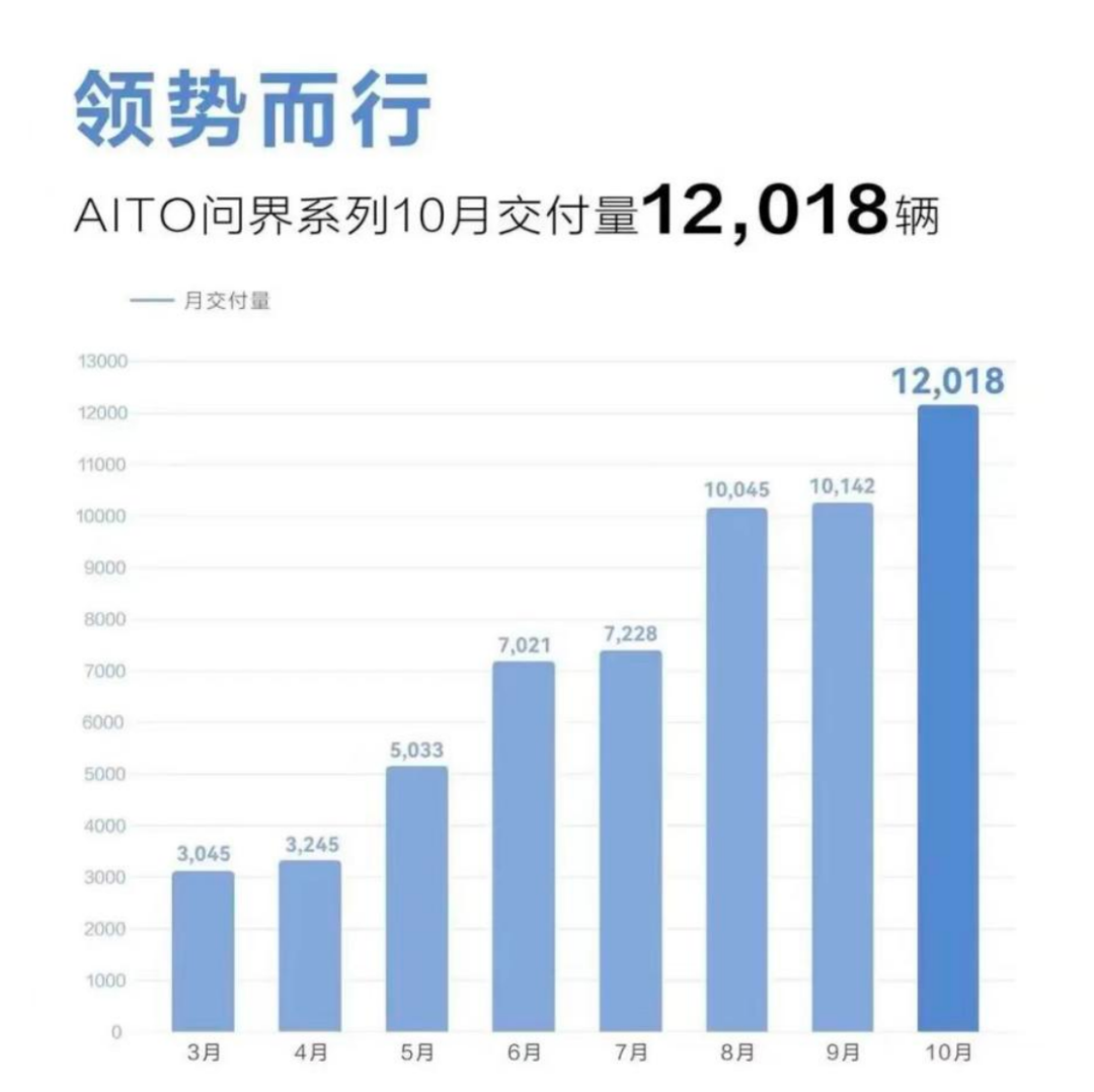 众所周知,同样和华为联合造车的塞力斯,依托于华为技术支持外加线下渠道的优势,已经取得了非常可观的销售成绩。最新数据显示:2022年10月问界AITO销量上升至1.2万台,实现交付以来的连续第八个月正增长。