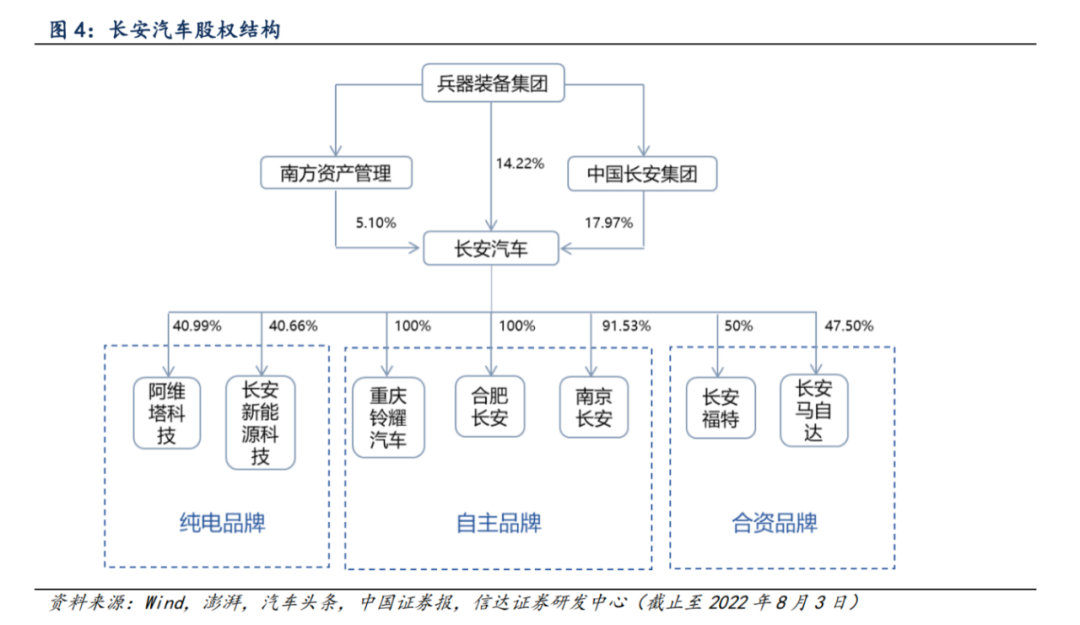 信达证券的研报显示,截至2022年8月3日,长安汽车对阿维塔的持股比例为40.99%,要略高于长安新能源(即深蓝汽车的主体企业)。如此来看,长安汽车在纯电品牌的“长子”是阿维塔,“次子”才是长安新能源。