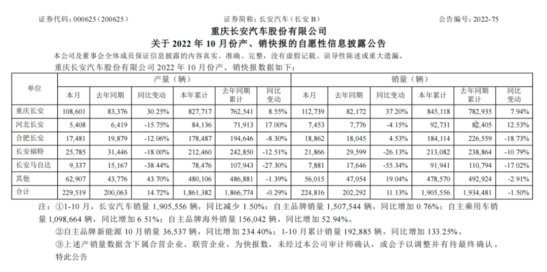 而从长安汽车最新公布的产销数据看:2022年10月长安汽车累计销量22.48万台,其中新能源汽车销量3.65万台,新能源汽车销量占比16.25%;前三季度长安汽车累计销量190.56万台,其中新能源汽车销量19.29万台,新能源汽车销量占比仅10.12%。