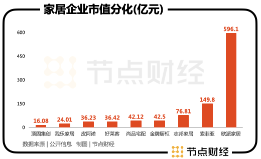 与业绩有同样走势的还有资本价值分化。截至11月11日收盘,欧派家居的市值接近600亿元,遥遥领先其他几家。