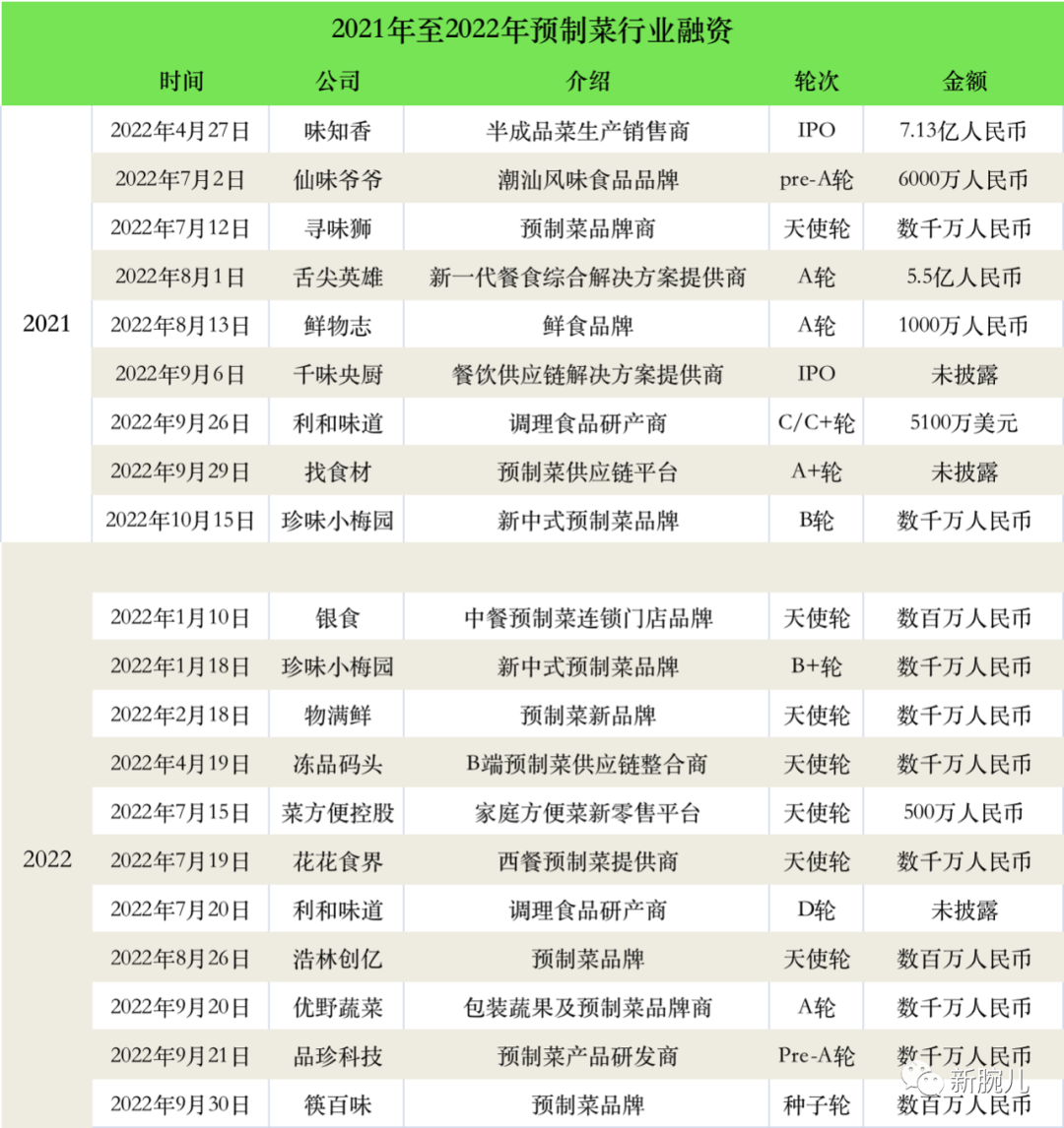 新腕统计了2021年至2022年国内预制菜行业融资列表。
