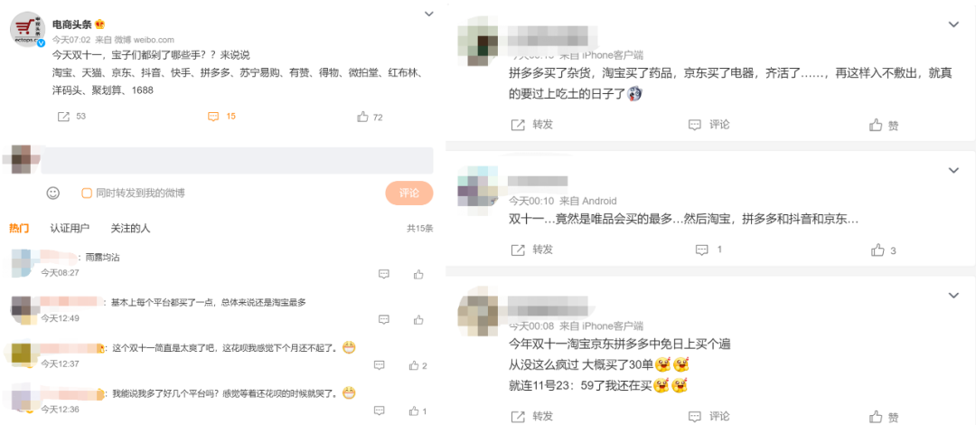 目前,很多消费者已经能根据平台特性做出差异化的选择。微博上就有网友表示,今年在拼多多买了杂货,淘宝买了药品,京东买了电器;还有网友称今年是“雨露均沾”“唯品会买的最多,然后淘宝、拼多多、抖音和京东”。