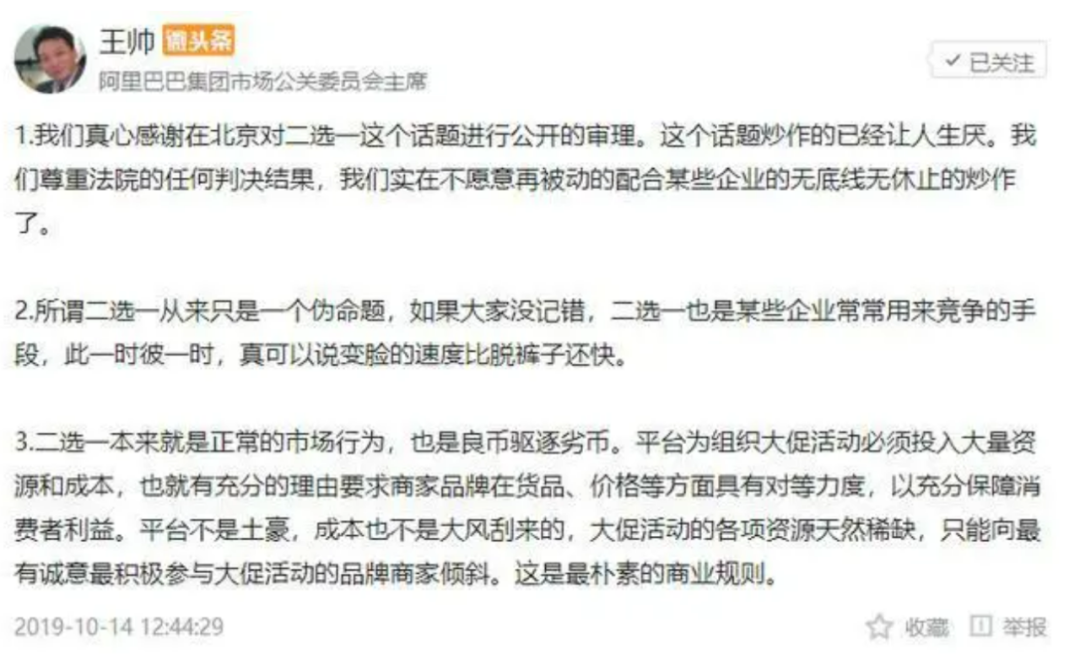 2019年双11前夕,阿里集团市场公关委员会主席王帅曾在微博为“二选一”站台,称其是正常的市场行为、最朴素的商业规则;话音刚落,京东便回怼称,“涸泽而渔的结果是让天下的生意越来越难”;随后,拼多多高层也加入战局,并毫不避讳地指控阿里倚强凌弱,让消费者和商家蒙受损失。