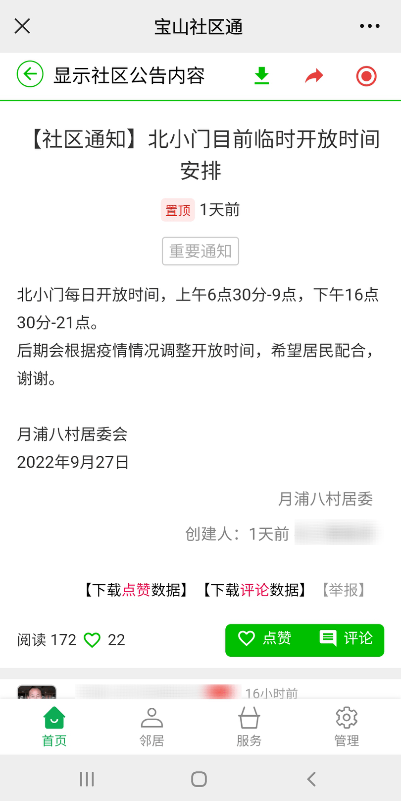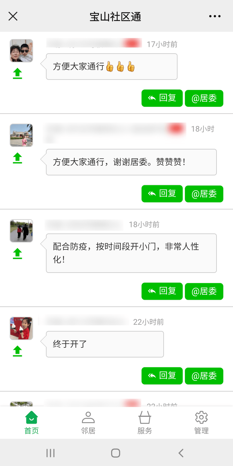 近日,宝山区月浦镇月浦八村有居民在“社区通-小区群”版块发出希望打开边门的呼声,并且此类呼声愈演愈烈。月浦八村居委工作人员看到居民的诉求之后,高度重视,立即与物业、业委会以及镇相关部门进行商议。考虑到小区边门靠近公交车站、菜场等公共场所,若长期封门,居民只能从正门绕行,对腿脚不便的老年人而言,造成生活上的极大不便。经综合考量决定在高峰段对边门进行开放,并通过调整物业人员、招募社区志愿者等方式进行边门看护力量“补缺”。小区边门的重新开放,不仅满足了居民方便出行的需求,更让居民们感受到家门口的美好生活。