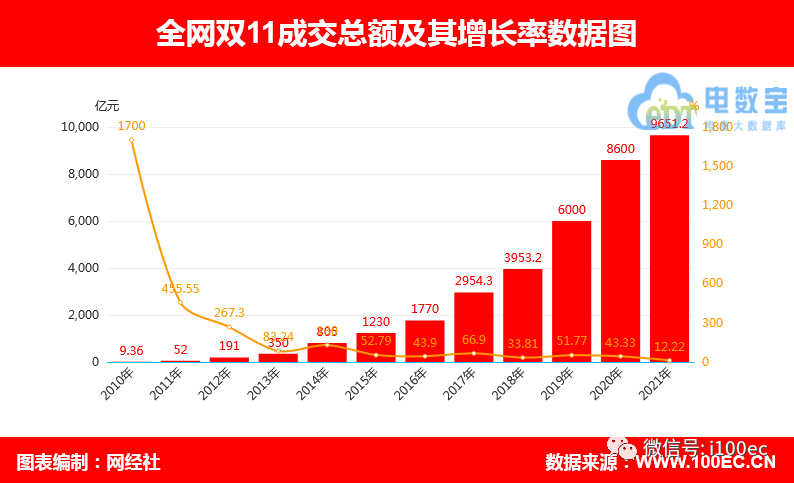 据网经社电商大数据库“电数宝”(DATA.100EC.CN)显示,去年全网双11成交总额为9651.2亿元,同比增长12.22%。