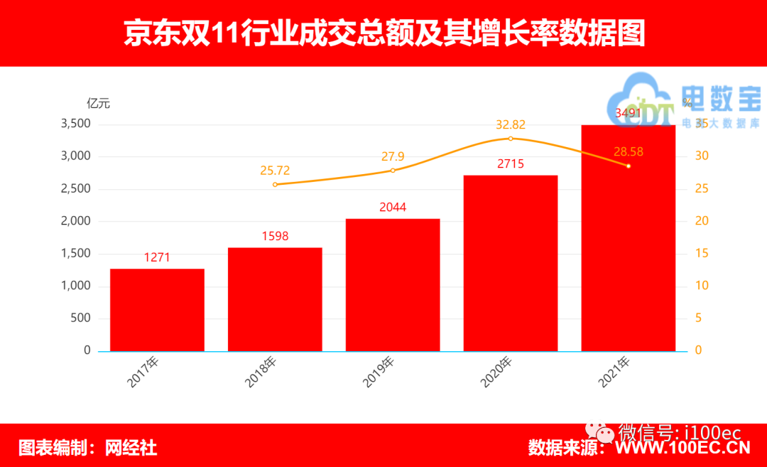 据网经社电商大数据库“电数宝”(DATA.100EC.CN)显示,2021年双11,京东成交额为3491亿元,同比增长28.58%。