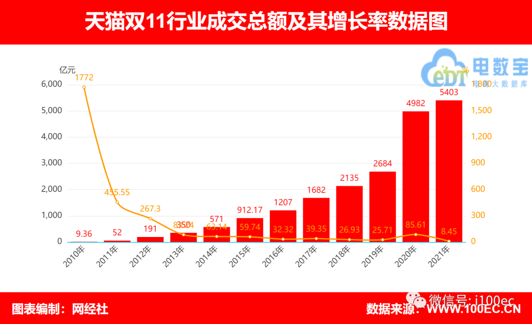 双11期间,天猫相继对外发布战报。截至11月10日零点,天猫双11已有148个成交额增长超100%的品类。不过,直至最后,天猫方面也并未透露最终数据,只表示交易规模与去年持平。据“电数宝”(DATA.100EC.CN)显示,2021年天猫双11成交额为5403亿元,同比增长8.45%。