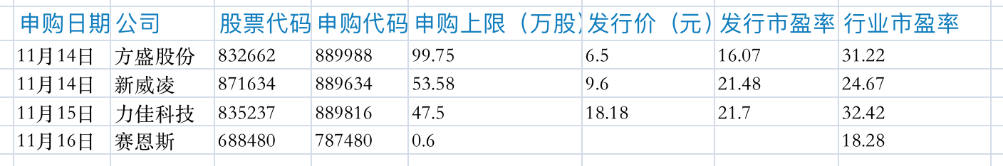 申购方面,本周公司数相对较少。11月14日有北交所公司方盛股份(832662.BJ)和新威凌(871634.BJ);11月15日为力佳科技(835237.BJ);11月16日有赛恩斯(688480.SH)。