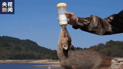 每天带小黄麂来到湖边喝奶