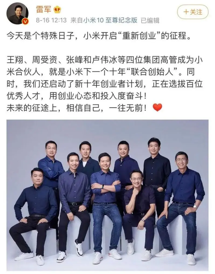 2020年,小米十周年之际,雷军宣布了下一个十年的合伙人:王翔、周受资、张峰和卢伟冰。
