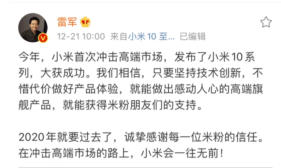 回溯两年,2020年2月13日,凭借小米10系列,小米正式跨越性价比走向高端,由于涨价幅度颇高,开始各方并不看好,但最终小米10系列以总体接近600万台的销量,击垮了所有人的傲慢与偏见,为此雷军还专门发了条微博一舒快意。
