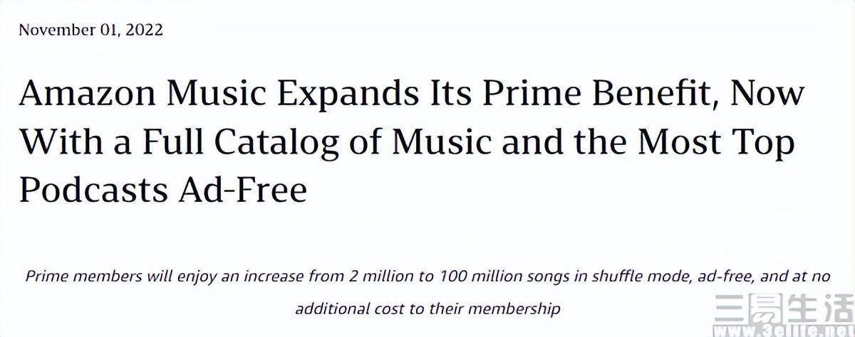 日前,亚马逊音乐(Amazon Music)方面宣布向所有Prime会员免费开放全量音乐曲库,数量约有1亿首、且没有广告,但用户只有随机播放这一种模式可供选择,并适用于任何艺术家、专辑或播放列表,此外还包括无广告按需收听所有播客节目。但从体验方面来说,权益扩大后的Prime Music,更类似于没有广告的免费版Spotify。