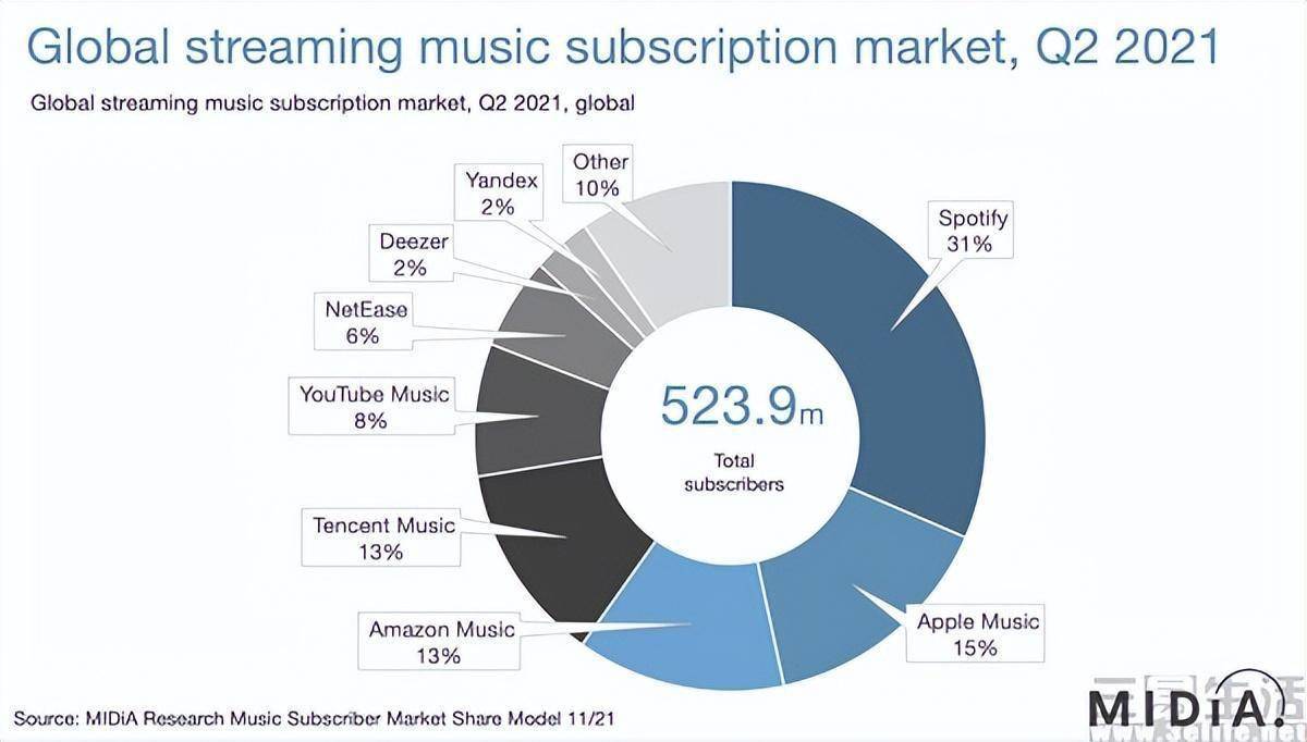 当时,Netflix的订阅模式还被外界成为“新的商业模式”,并且全球订阅用户数量才刚刚达到5000万,就更别提用户为流媒体音乐平台付费了。即便是如今,根据MIDia Research发布的相关报告显示,截至2021第二季度,全球所有流媒体音乐平台的付费用户也才达到达5.239亿。这也就意味着实际上只有10%至15%的用户才会为音乐流媒体付费。
