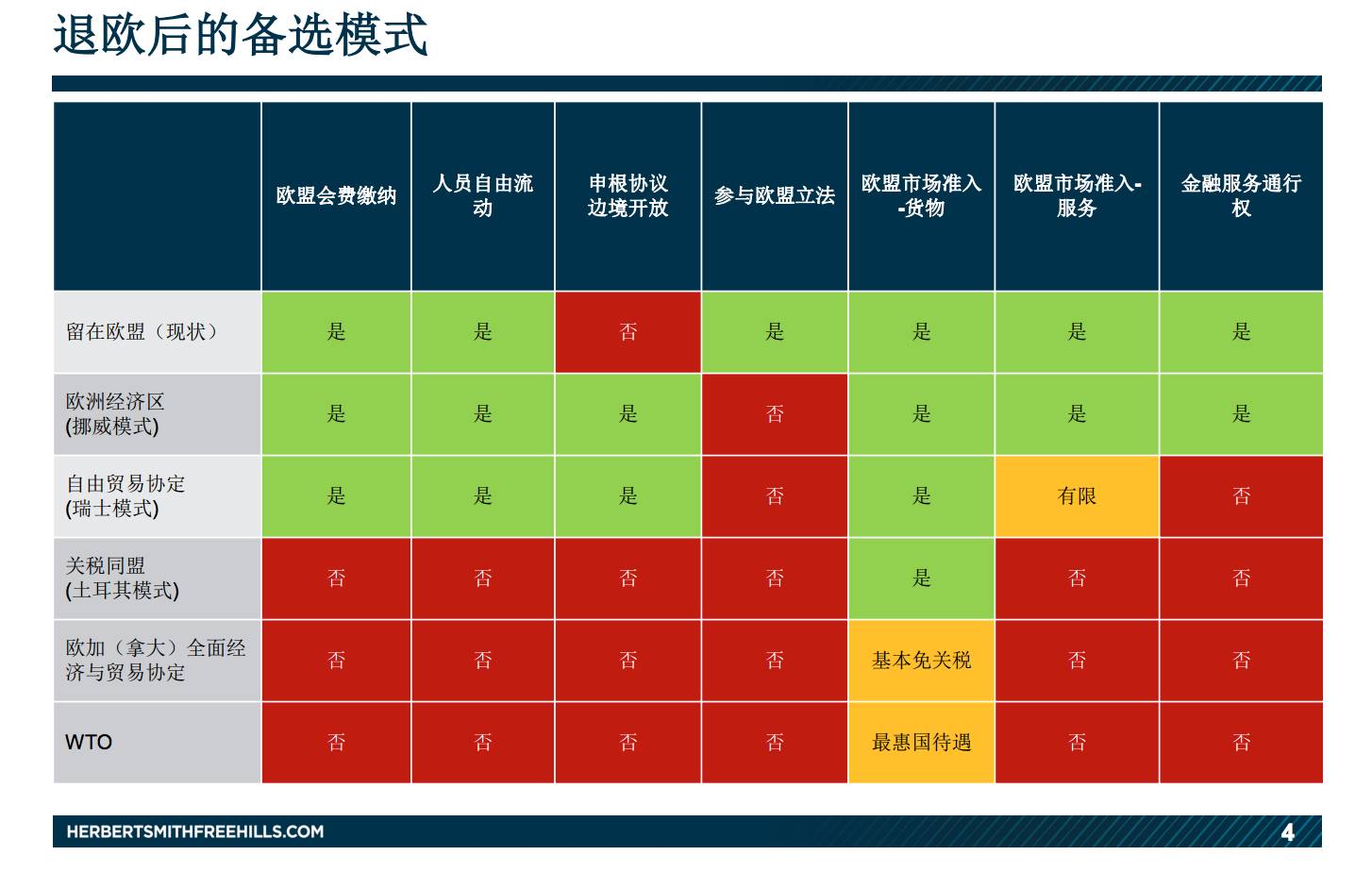 根据大部分的评论来看,后两种模式以及WTO模式因为享受不到大部分的欧盟权益,所以不会选择这些模式。比较有可能的是挪威和瑞士模式。