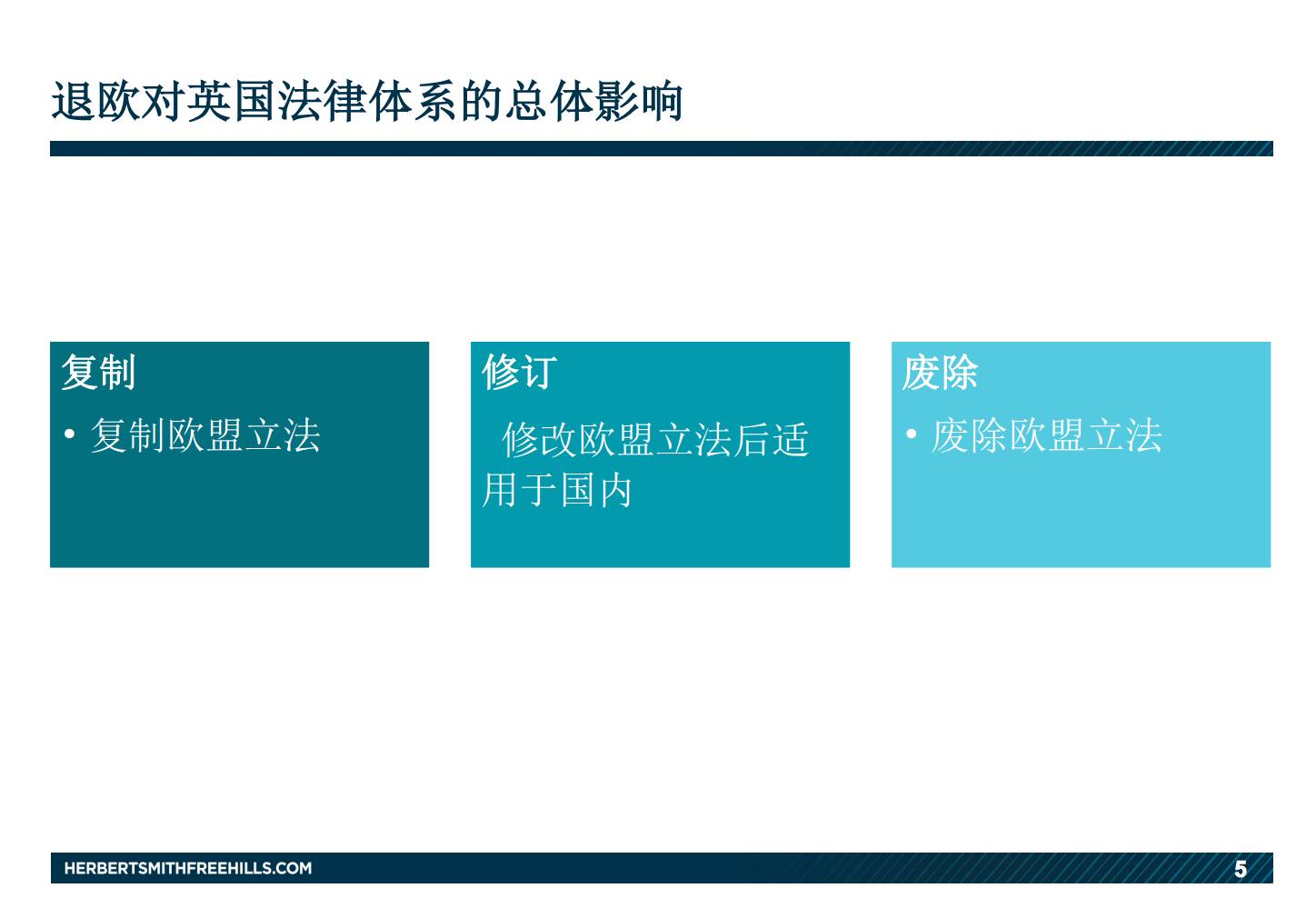 目前的分析来看,最后一类即可以直接废除的法律是非常少的。因为英国的法律制度和欧盟已经磨合多年并互相渗入。如果要产生大的变革,对法律制度来说是非常不稳定的,会产生一个很大的不确定性,对生产、生活都会造成造成很大的影响。英国立法者在这个过程也会以稳妥为考虑。所以我们预计,至少在短期内 英国的立法不会有重大的变化。