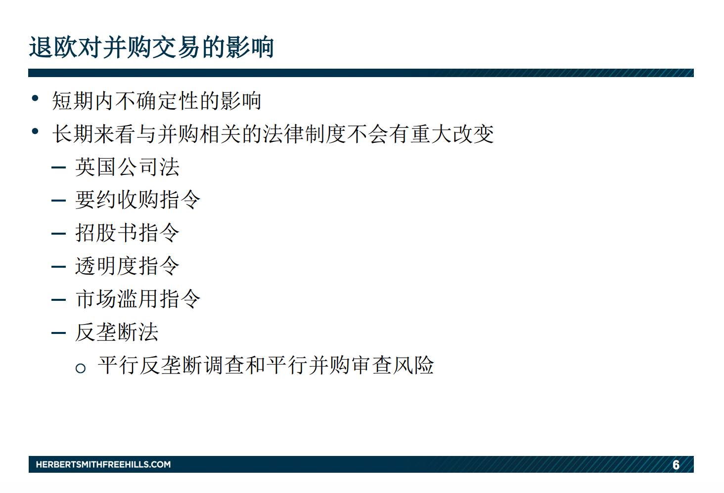 前面说了,整个脱欧进程要持续数年,所以目前的影响更多体现在短期市场波动。长期来看,跟并购有关的法律制度不会有重大变动。