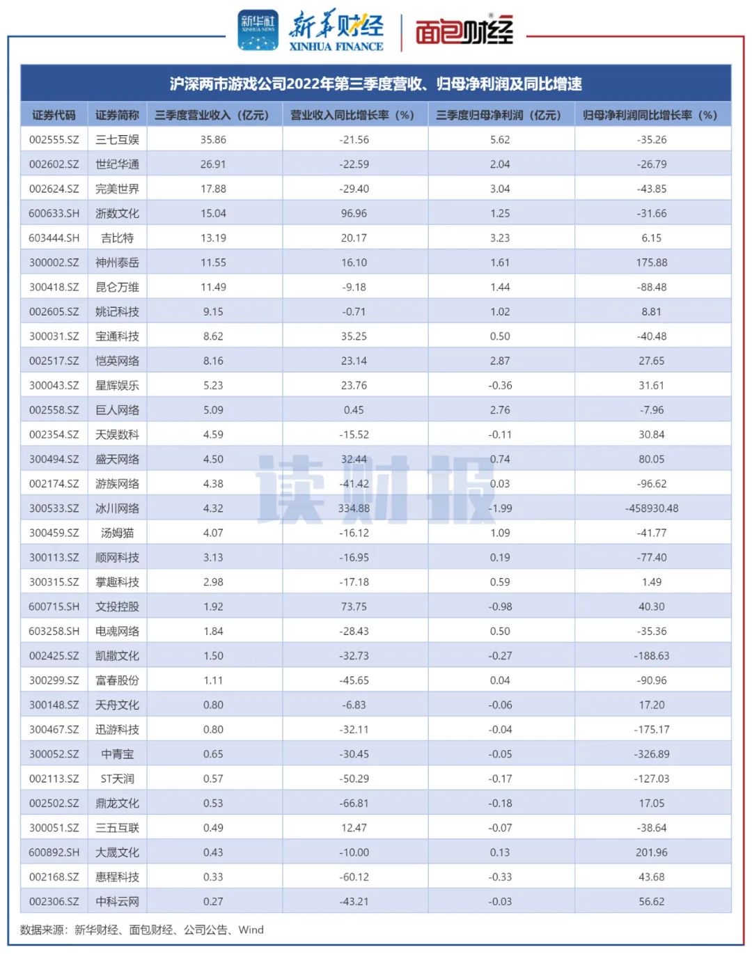 从具体公司来看,三七互娱、世纪华通、完美世界的营业收入位居沪深两市游戏公司前三名。2022年第三季度,这三家公司的营收、归母净利润均同比下降超过两成。