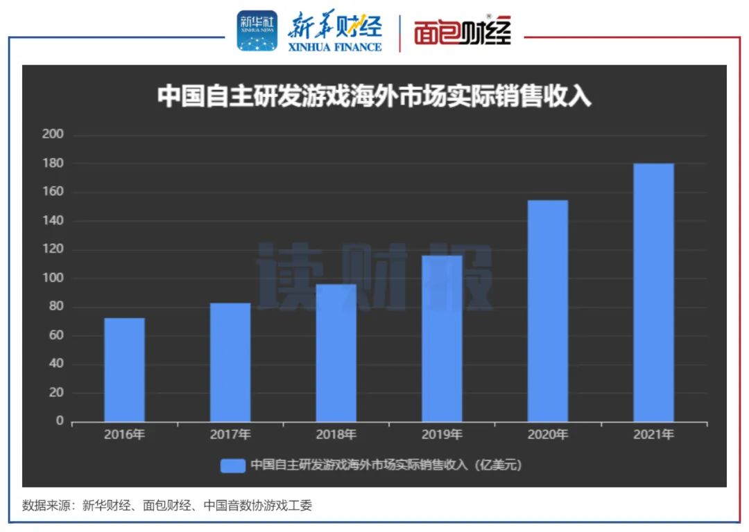 2021年,中国自主研发游戏海外市场实际销售收入进一步上升至180.13亿美元,同比增长16.59%。而根据第三方研究机构Newzoo的数据,2021年全球游戏市场总收入仅同比增长1.4%。