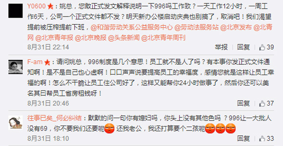 失去了周六的不只有肖筱。近日,58同城也被曝全员施行996(早9点到晚9点、一周6天上班)工作制。多位网友爆料称58同城将实行全员996,不过并没下达正式邮件,只是以口头形式临时传达通知,且没有任何补贴。很快58同城员工发起了“拒绝上班,抵制CEO”的声讨,而CEO姚劲波的微博页面也被疑似58员工及其家属攻占,单在一条微博下就有上千条怒骂和求解释的留言。之后58方对此事做出的回应是:每年的9、10月份是平台业务高峰期,会有常规性动员,但公司不会强制要求所有人一定要按照“996”的规定来安排工作。