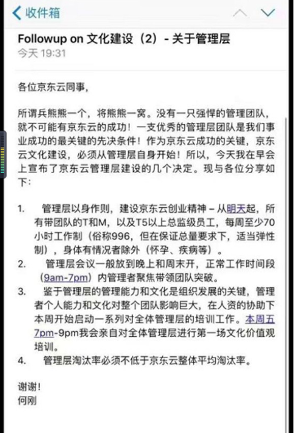 近日被爆出实行996的还有京东云。据日前泄露的京东云部门内部邮件显示,为了建设创业精神,京东集团副总裁何刚要求京东云管理层以身作则,开始执行每周至少70小时的工作制。