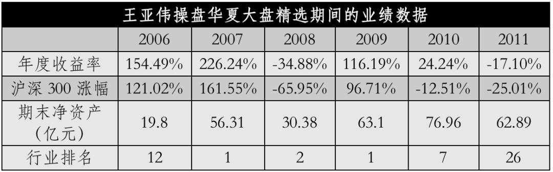 次年,华夏大盘精选年度收益率继续高歌猛进,达到226.24%,勇夺行业冠军。王亚伟也借此登顶,成为公募一哥。