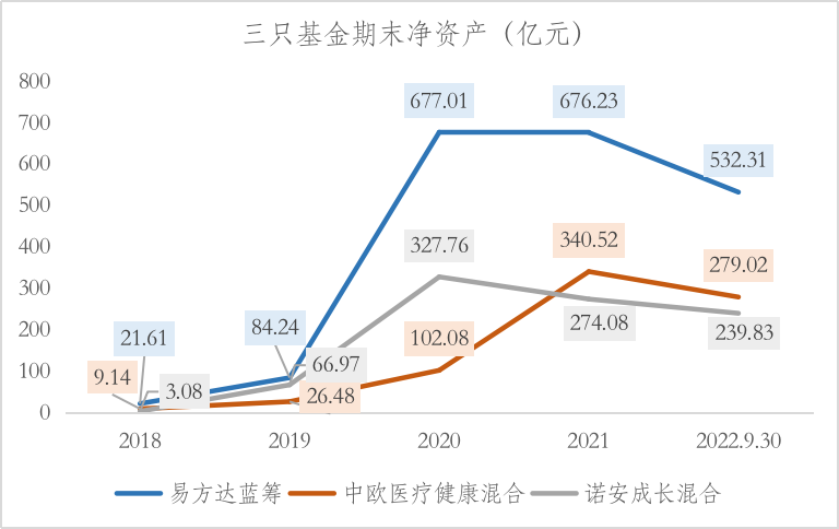 年轻基民们同样疯狂追星、下注。2018年底,诺安成长混合基金的期末份额仅为5.97亿份,期末净资产仅为3.8亿元。2019年底,中欧医疗健康混合A期末份额仅为11.7亿份,期末净资产仅为20.28亿元。