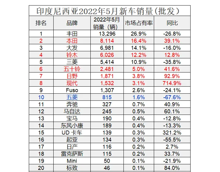 印尼2022年5月的新车批发销量
