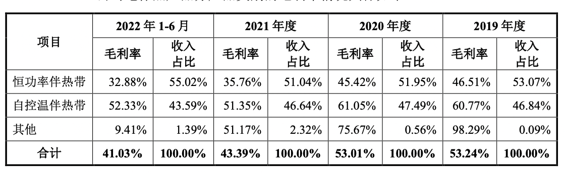 报告期内,公司综合毛利率分别为 50.28%、49.40%、43.41%、41.14%,其中2021年毛利率下滑明显。从主营业务来看,公司毛利率下滑主要系受电伴热产品毛利率及收入占比的变动影响。