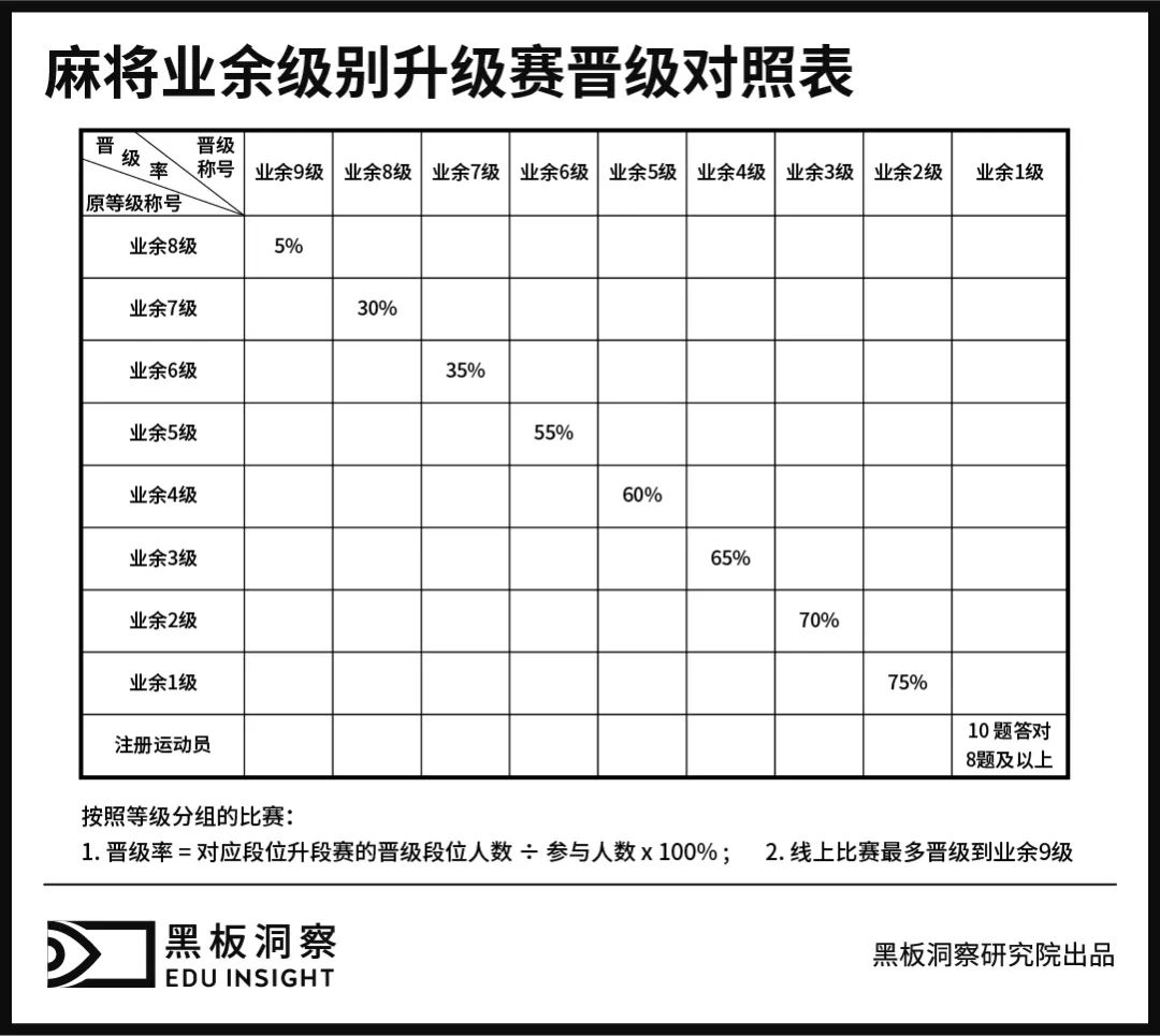 根据相关规定,麻将考级共有 18 级,从低到高依次为,业余 1 级~业余 9 级,专业一段~专业九段。其中业余 1 级可以通过线上答题获得,业余 2 级~业余 9 级可以通过线上、线下升段赛获得,专业一段以上仅限线下比赛获得。