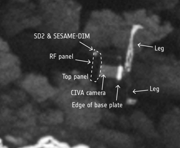 研究人员曾猜测菲莱在着陆后被弹到一个暗处的深沟,而这种分析也被最新的照片证实。这是科学家首次能清晰看到登陆器的主体,以及三条腿中的两条。