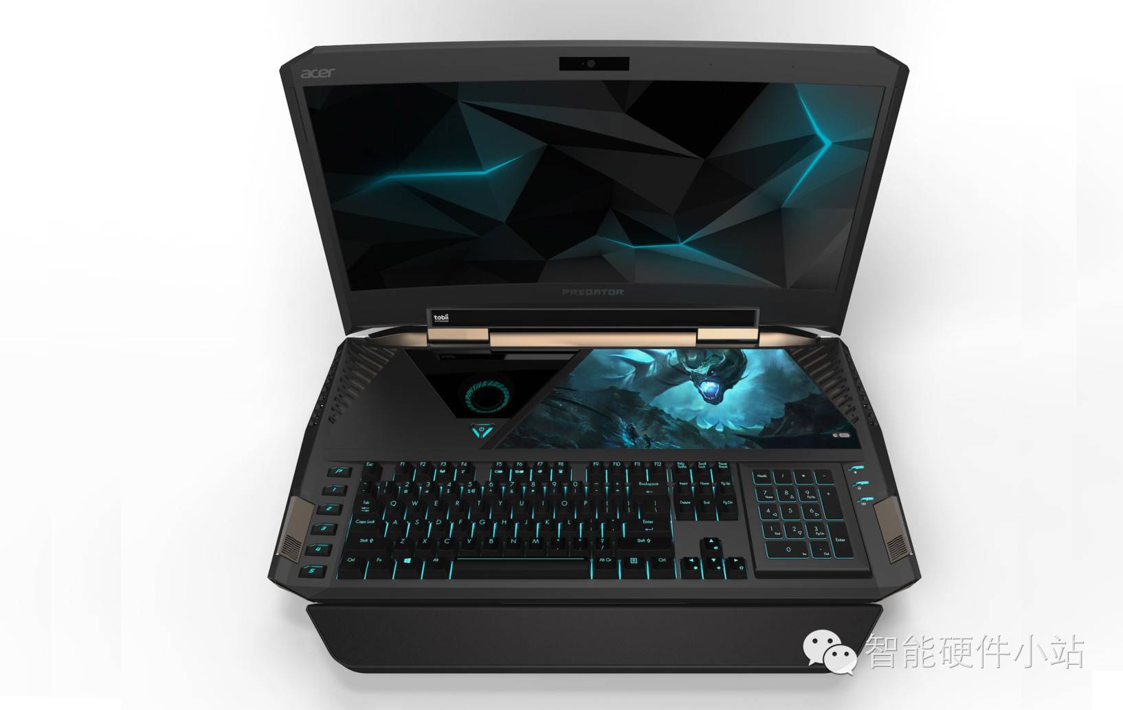 除此之外,21X 还搭载了第七代 Core i7 处理器、双 GTX1080 显示、Tobii眼球追踪、Cherry MX 轴的机械键盘、4.2 声道喇叭系统,以及隐藏在数字键区底下的触控板等。不过,它需要两个电源才能运行。