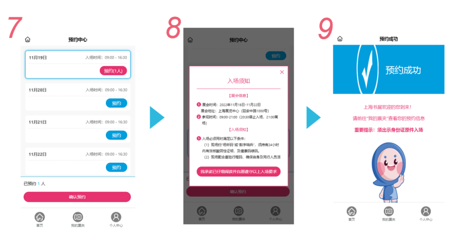 1. 通过小程序“我爱读书我爱生活”实名预约后(含姓名、手机号、身份证号等),将接收到短信提示,在入场前完成防疫申报(上传行程码、核酸报告截图等),通过短信告知审核信息及入场操作办法。