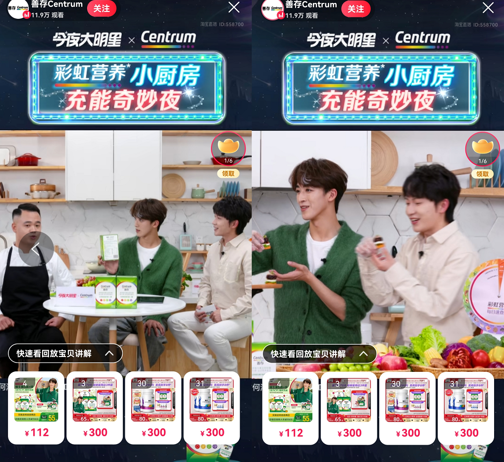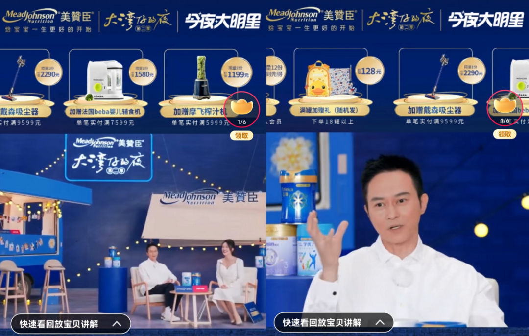 同样,冠名了《大湾仔的夜2》的美赞臣奶粉在和其代言人张智霖的双十一直播互动中,不仅把节目中的餐车拉到了现场,内容设计上更是主要围绕节目进行发散。张智霖在对话中状态放松,也有效把奶粉的特质和节目中的做菜搭配在一起阐述,同样完成了潜移默化输出品牌,且明星嘉宾合理露出的效果。