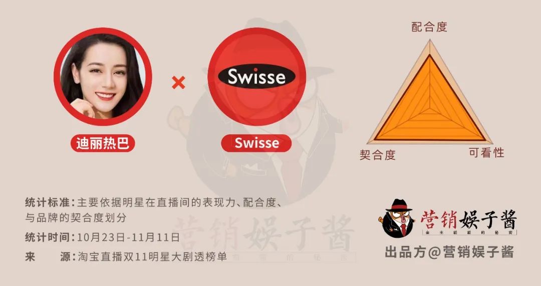 而在同样对食品安全和功能介绍较为敏感的保健品领域,Swisse品牌与迪丽热巴的组合就依靠更好的流程和更周全的准备,在稳健中打出了亮点。