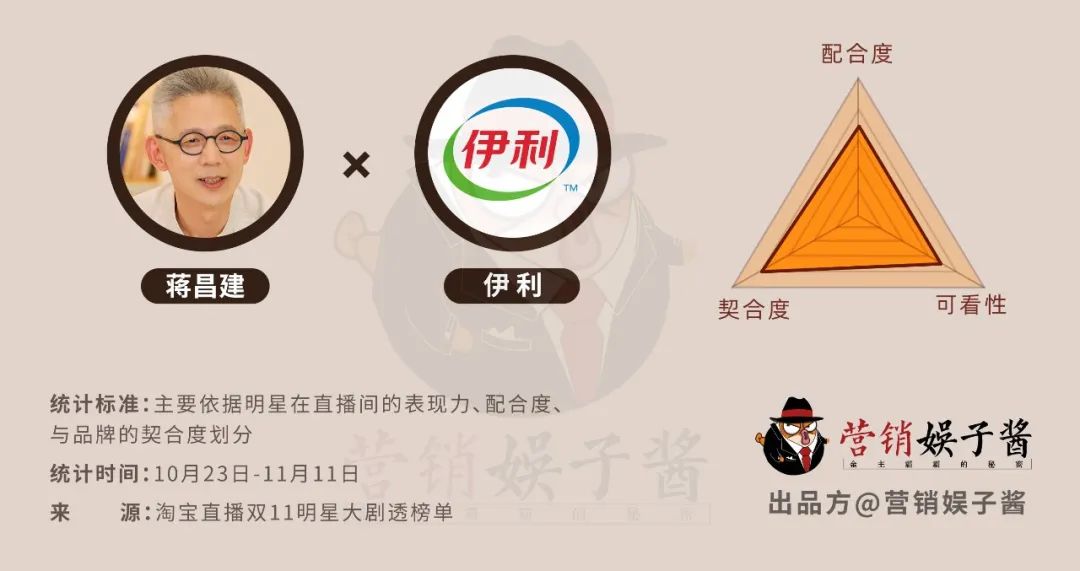 双11期间,伊利旗下的多品类产品找到了包括黄健翔、苏醒在内多领域明星甚至公司高管上场带货,而面向少年儿童的QQ星系列产品与蒋昌建搭配,显然是看中了他背后的《最强大脑》IP,人与品其实有相当的契合度,但由于产品受众的特殊性,在营养成分和功能介绍上,则需要倍加小心。