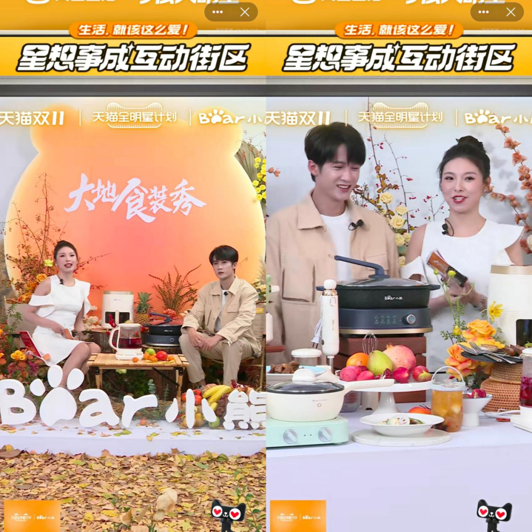 营造生活感是最直接的解决方式。小熊电器和品牌代言人檀健次的合作,便在直播现场的布置上颇为用心,选定了秋日氛围的主题,并且打造了美食+美景+产品的创意结合。