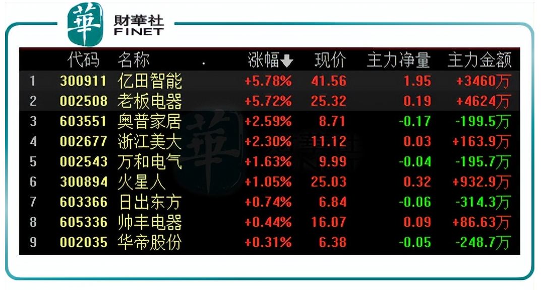 截至11月14日,厨电板块再度拉升。个股中,亿田智能(300911.)、老板电器(002508.SZ)均涨超5.7%,奥普家居(603551.SH)、浙江美大(002677.SZ)、万和电气(002543.SZ)、火星人(300894.SZ)等股纷纷飘红。