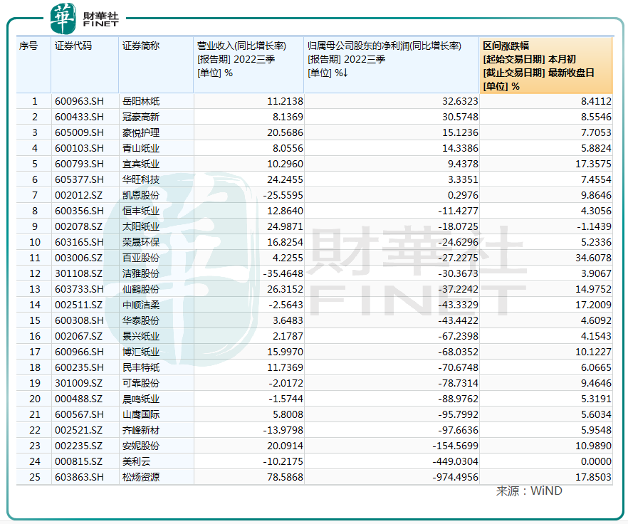 从Wind造纸中信成份股看,2022年前三季度净利润同比下滑的企业占绝大多数。其中下滑较大的有安妮股份(002235.SZ)、美利云、松炀资源(603863.SH)等。