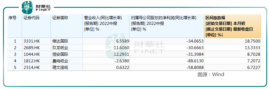 港股方面,维达国际(03331.HK)、玖龙纸业(02689.HK)、阳光纸业(02002.HK)、晨鸣纸业(000488.SH,01812.HK)、理文纸业(02314.HK)等也均现不同程度上涨。