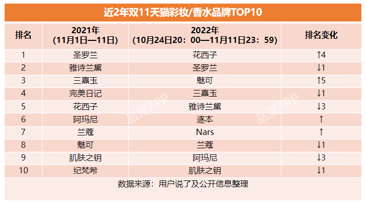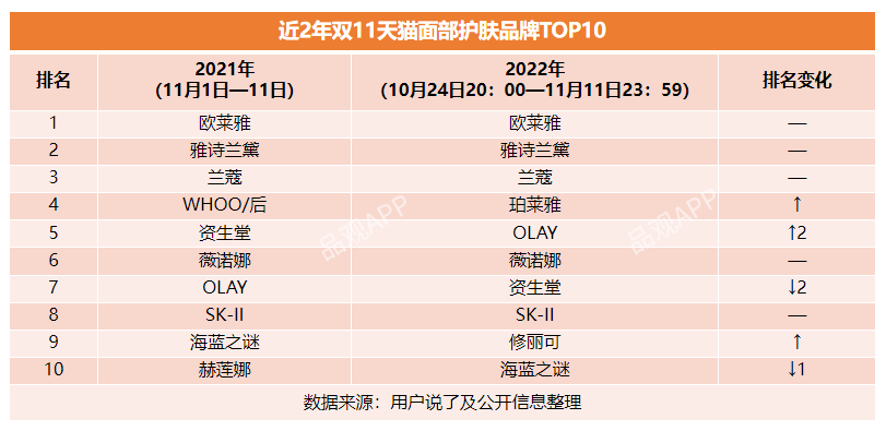 细分至护肤品类,今年双11天猫护肤品牌TOP10中,有5个品牌维持了去年的排名,珀莱雅、OLAY、修丽可排名上升,资生堂和海蓝之谜排名下降。其中,后、赫莲娜掉出TOP10。