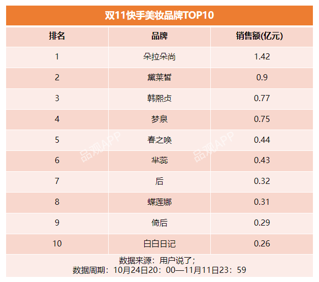 从排名来看,今年双11期间,国货品牌在快手平台没有特别的亮点,今年快手TOP10中,除了后、韩熙贞,其余8席均为“快品牌”,其中朵拉朵尚、黛莱皙、韩熙贞占据前三。