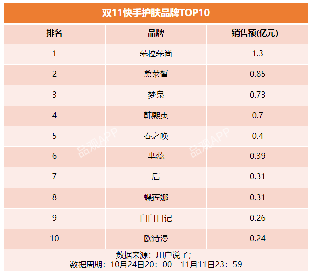 朵拉朵尚通过与快手平台深度绑定,在今年双11期间获得快速增长。今年双11朵拉朵尚以1.42亿元居于快手双11美妆品牌榜首。在快手美妆个护热销商品TOP20榜单中,朵拉朵尚也有3款产品上榜。